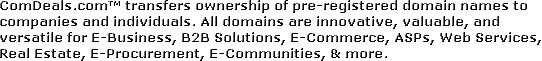 ComDeals.com transfers ownership of pre-registered domain names to companies and individuals. All domains are innovative, valuable, and versatile for E-Business, B2B Solutions, E-Commerce, ASPs, Web Services, Real Estate, E-Procurement, E-Communities, & more.